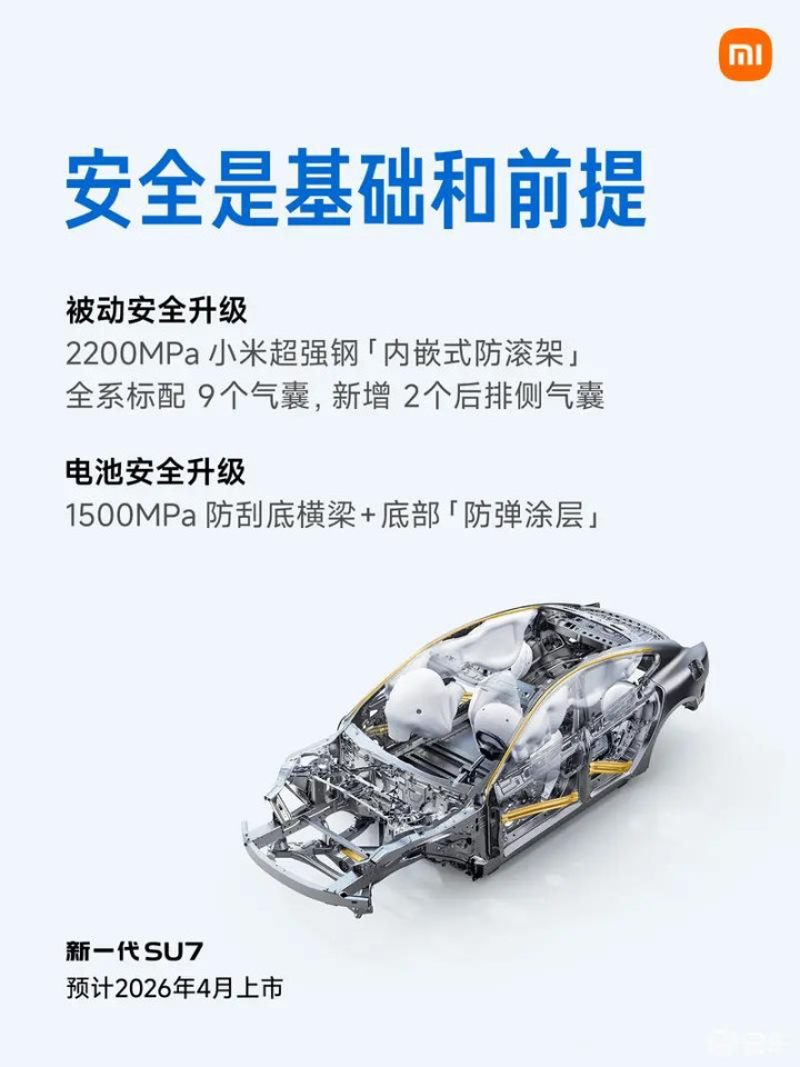 安全性方面,新一代SU7全系标配9个安全气囊,相比老款车型的7气囊新增了后排左右2个侧气囊。此外还全系标配了2200Mpa热成型钢车门防撞梁以及“内嵌式防滚架”。