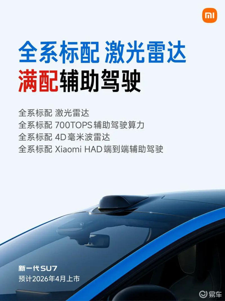新一代SU7辅助驾驶硬件规格全面升级,入门即满配。全系标配激光雷达和4D毫米波雷达,配合700TOPS算力的旗舰芯片,实现全天候、全场景的精准环境识别。无论在暗光、雨雾等复杂天气条件下,还是面对遮挡物、行人穿行等复杂场景,系统均能快速响应,稳定追踪,显著提升行车安全性与驾驶体验。