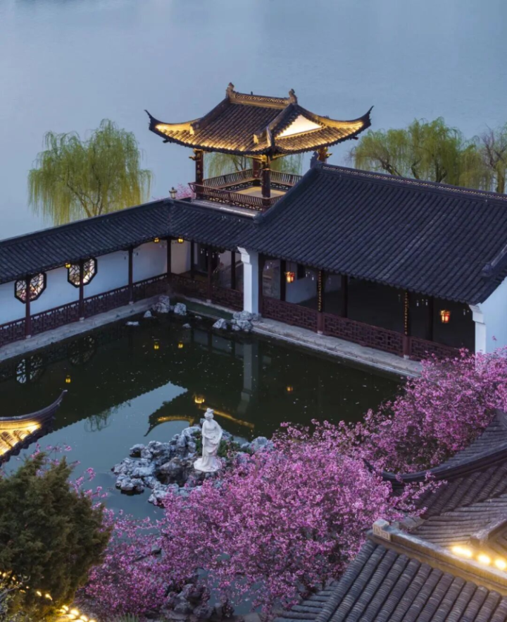 莫愁湖是世界少有的、以古代女子定名的名湖,莫愁女就是这方湖水的灵魂。莫愁水院池中,汉白玉的莫愁女泥像风采玉立,手挽桑篮,长裙曳地,如凌波仙子款款而来。身侧,海棠花枝探过水面,花影、东谈主像、湖水、据说交汇成跳跃时空的苟且。