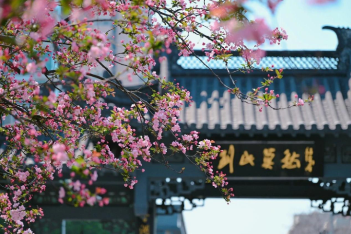 郑板桥曾盛赞莫愁湖:“湖柳如烟,湖云似梦,湖浪浓于酒。”如今海棠花开,这份烟雨疲塌的诗意又添了几分娇艳与祥和。