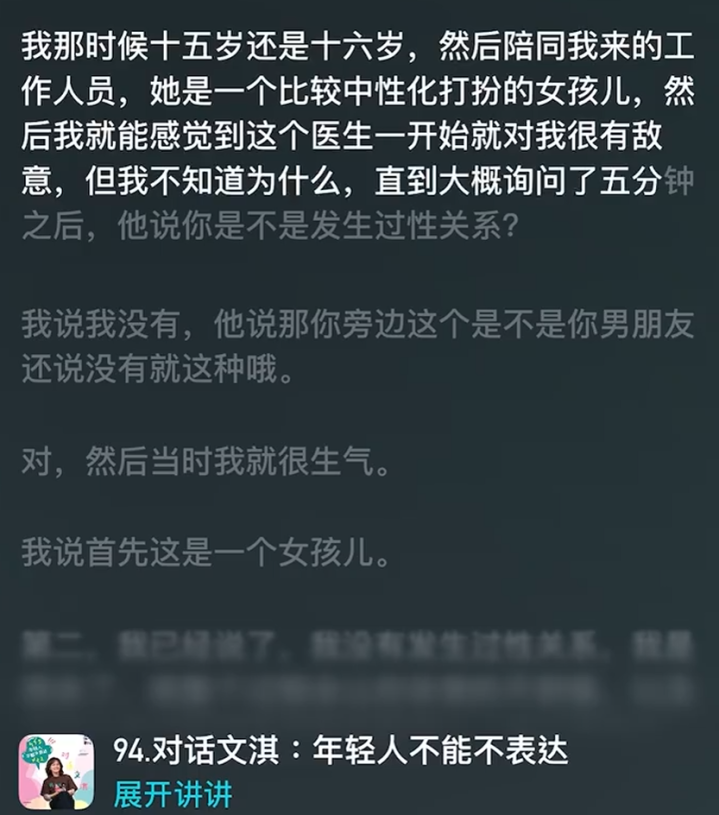 文淇回忆,所有查验经由手法极其狰狞,环境莽撞、空泛秘籍保护,致使有医学生围不雅,令她感到十分欺侮、退避与身心不适。这一资格让她永久对妇科查验产生状貌暗影,也使她深切相连女性在就医经由中濒临的无语、羞耻与不安全感。