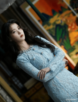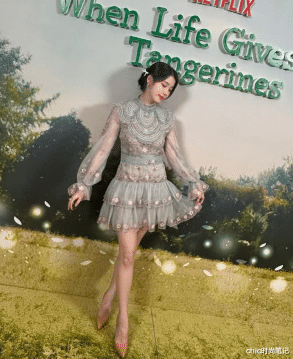 柔纱与蕾丝的会通带着风雅与淑女,裙身上的碎花刺绣又是重工与极新的搭配,重重叠叠的裙摆带着和煦与甜好意思,很顺应仙女感总计的IU。