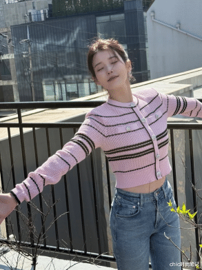 粉色条纹赤诚衫是作念了短款得谋略买球投注app,搭配浅蓝色修身牛仔裤,小露腰围的穿搭带着诊疗与轻松的氛围感。