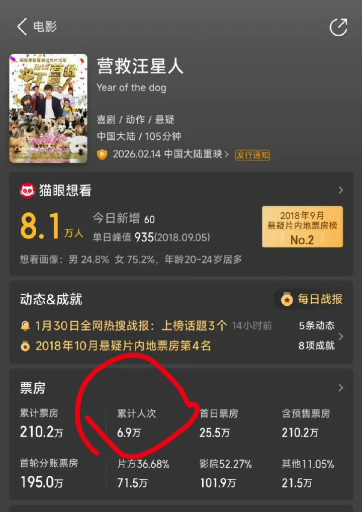 2026年2月14日,电影《营救汪星人》要重映了。这片子有点意思,不是新片,2018年就上过,当时票房210万,现在换个档期又来了。