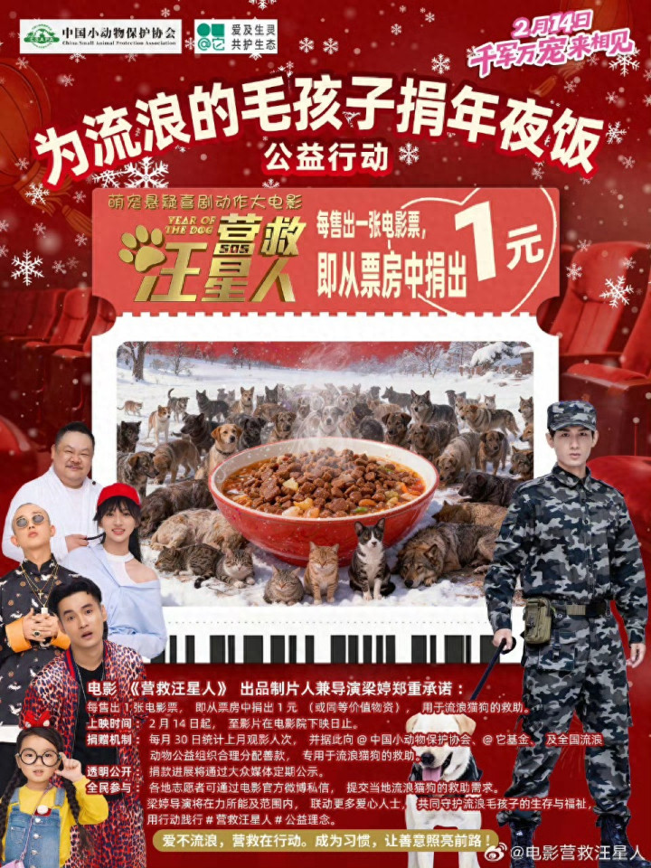 {jz:field.toptypename/}但这次不一样,片方放了个大招:每卖出一张票,就捐一块钱给流浪猫狗买年夜饭。