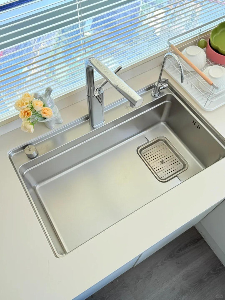 于是就改成了大单槽,体验之后嗅觉太爽了,再大的东西都能放进去洗刷,另外它也有特意的沥水篮,根底不存在无法沥水的问题。