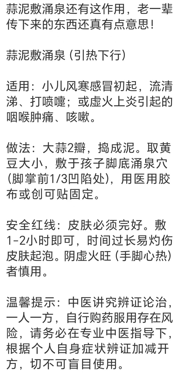 取几瓣带着辛辣香气的食材,细细捣成绵密的泥,再合手成小小的一团,轻轻敷在孩子足底最柔嫩的凹下处,用祥和的胶布固定好。不外一两个时辰的功夫,那股清烈的香气便会顺着肌肤冉冉渗进去,像一阵柔软的风,把躯壳里的沉闷与酷热缓缓引向眼下,让浮夸的身心逐渐悠闲下来。