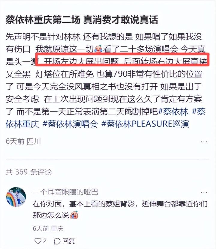 要是唯唯独个不雅众吐槽,可能仅仅运谈差,刚好买到了差座位,但偏巧好多座位的不雅众都一辞同轨的反应了吞并个情况。