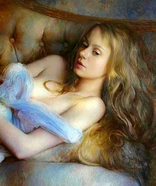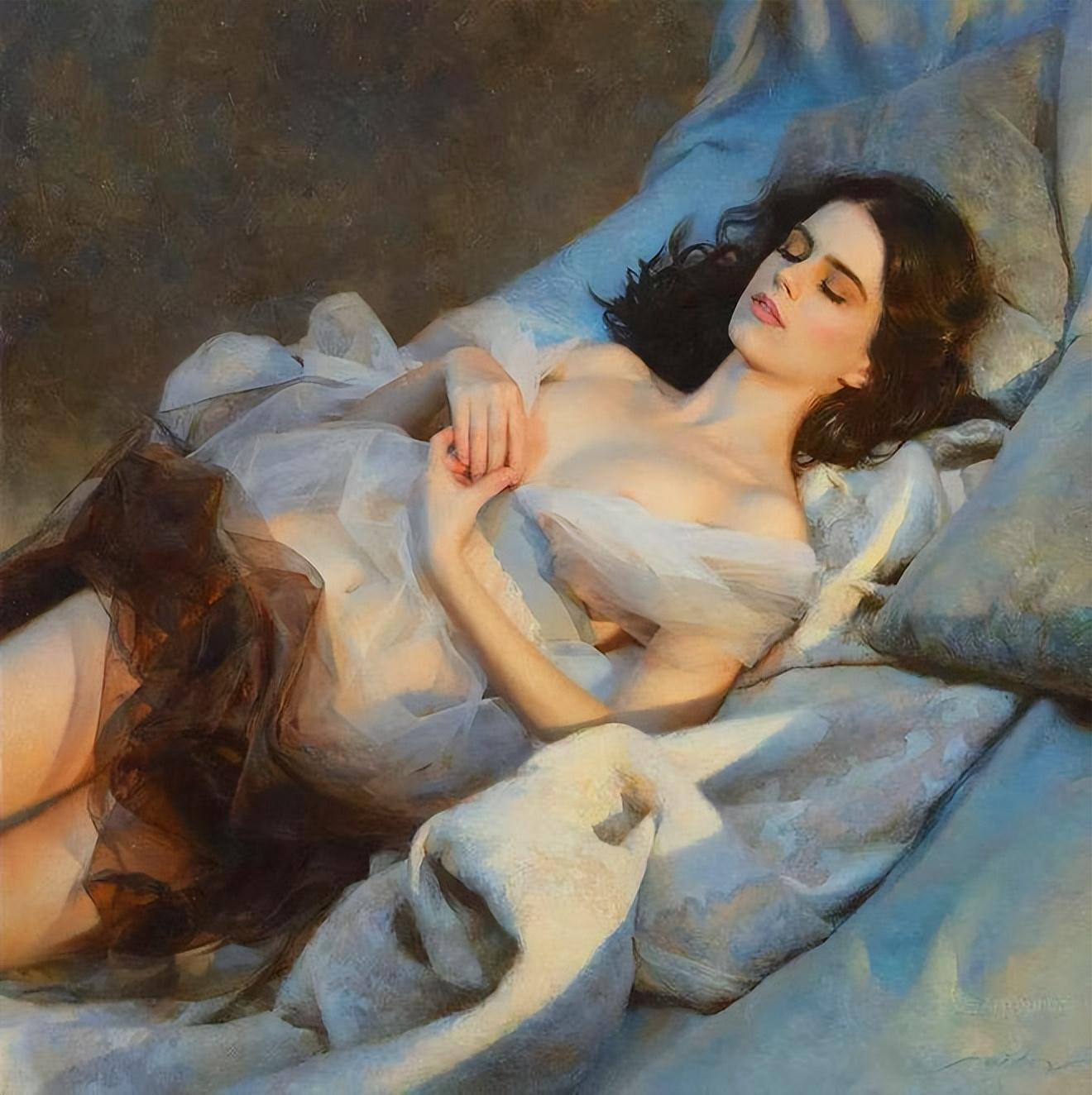 塞哆芙笔下的女友东说念主体油画,笔触雅致,用色轻亮,衣饰多接收透明的薄纱和蕾丝装,品性郁勃,并自带一种削弱的好意思感,被称为最完整的艺术,以致比艺术还艺术。
