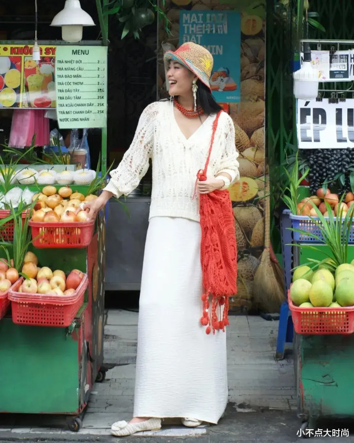 白色的镂空上衣,搭配白色的直筒半身裙,脚上穿白色的平底鞋,一整套白色系搭配,干净有气质,视觉显高。红色包包和项链、彩色草编帽四肢配饰,马虎度假风既视感。很合适小个子周末出游穿搭,平素酣畅又出片,拍照嘎嘎顺眼。▼