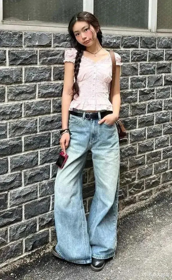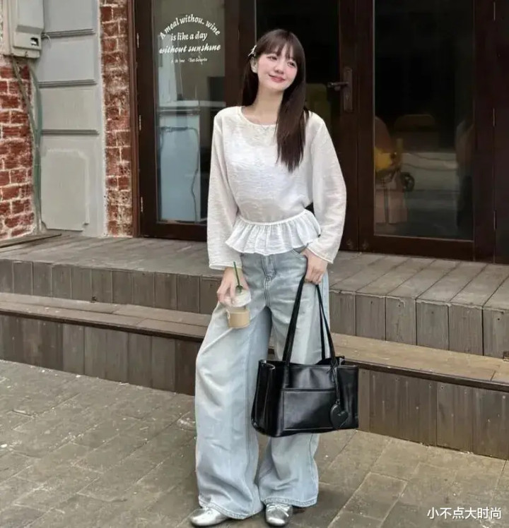 米白色小短衫的收腰策画打造出高腰线和小蛮腰,显高又显瘦,还增添了甜好意思气味,搭配淡色的高腰牛仔阔腿裤,安静大方,从简前卫马虎感。▼