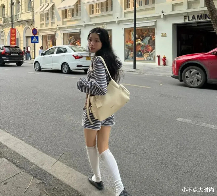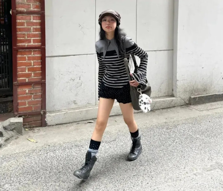 上长下短的穿搭勾画到手长脚也长,显高显瘦很当然,整套搭配又很斯文,条纹和波点小元素又点缀着俏皮的小道理。▼