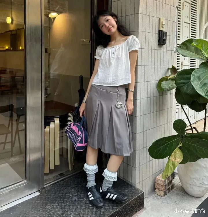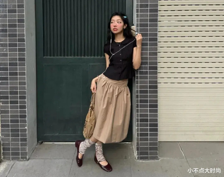 玄色的短袖衬衫搭配卡其色半身裙,上短下长很显高,从简经典又气质。衬衫的娃娃领增添甜好意思气味,脚上的条纹袜和酒红色单鞋有维握精细滋味,在细节处尽显斯文品位。▼