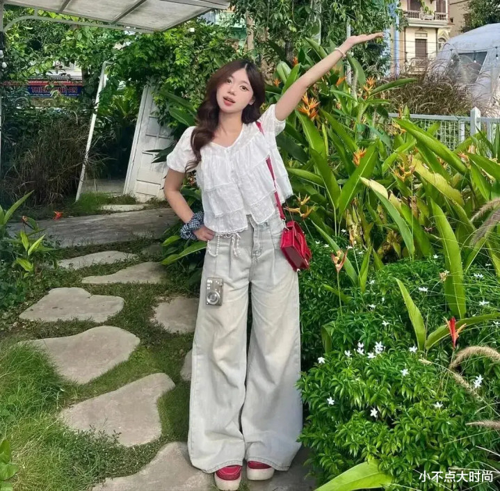 浅蓝色牛仔衬衫内搭白色短上衣,下身搭配米白色高腰阔腿裤,栽培腰线,显高又显瘦,一整套从简安静的减龄穿搭。用超大朵的大肠发圈扎丸子头,提亮整套穿搭,增添和缓放浪的甜好意思气味,越式穿搭的春天清甜感。▼