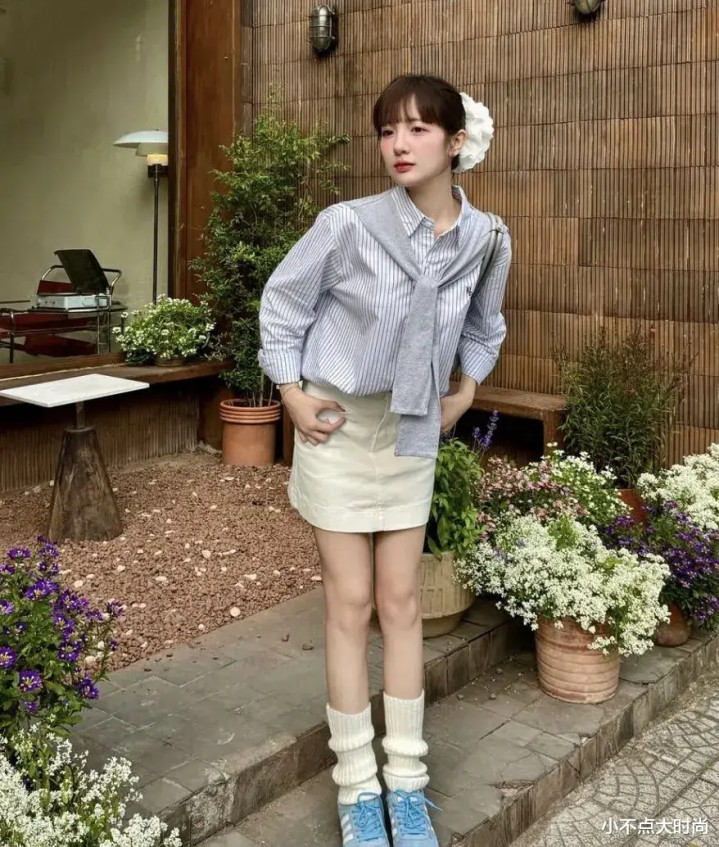 竖条纹的衬衫搭配奶酪黄的A字高腰短裙,很显腿长的一套搭配,小个子平素穿统统不挑东谈主。雾霾灰古道披肩,前卫又气质。白色花朵的大发圈和缓又放浪,一整套气质又酣畅,前卫又耐看。▼