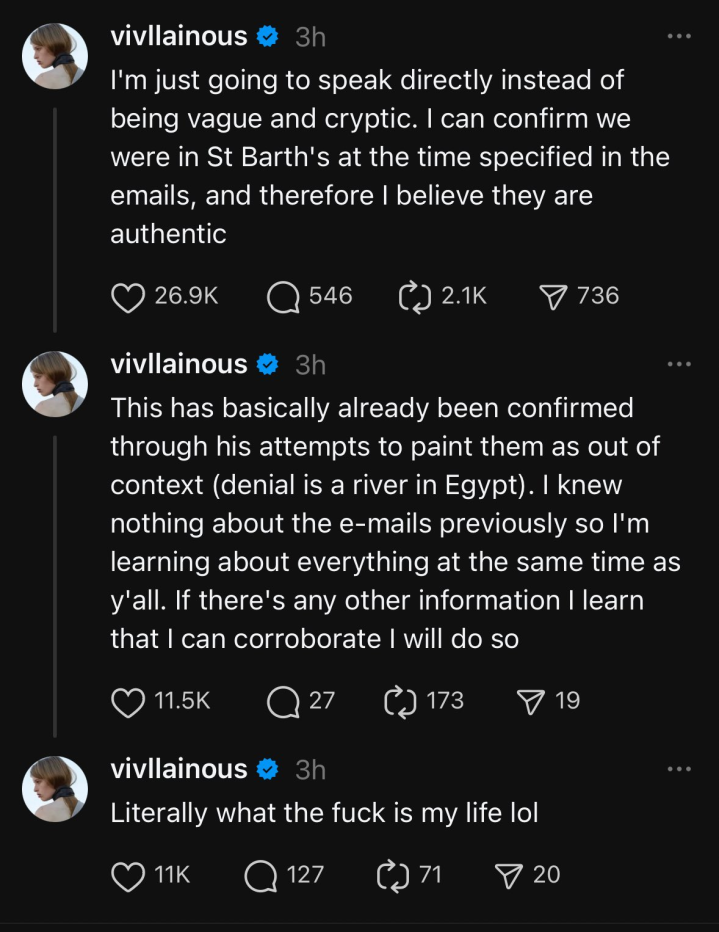 不过,虽然爱泼斯坦本人“死无对证”,马斯克本人也坚决否认与其有染,但马斯克的“好大儿”,已经变性的薇薇安·威尔逊则特意公开表示,爱泼斯坦邀请时候,他们全家的确是在附近小岛度假。威尔逊坦言自己此前对这些邮件一无所知,她还表示,将在“日后掌握更多能证明马斯克和爱泼斯坦关系的信息后做出补充”。