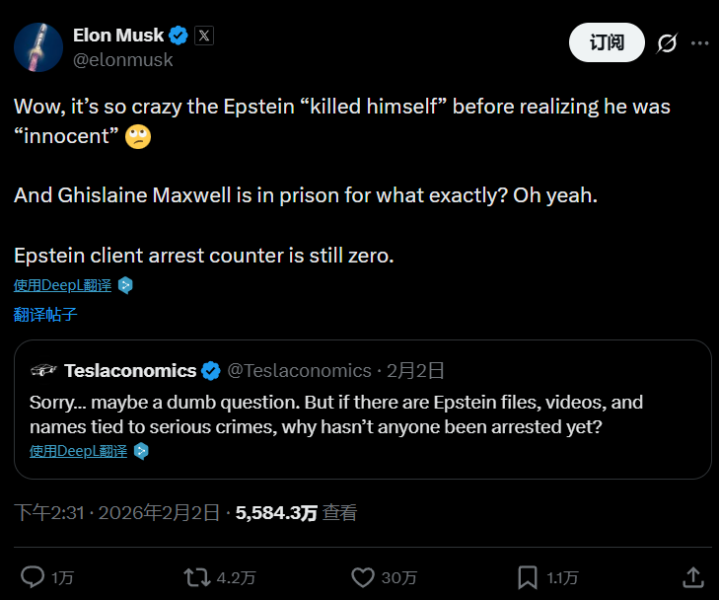 在美国司法部放出大量爱泼斯坦案档案,骇人听闻的案情和牵涉甚广的参与者引得全世界舆论哗然时,马斯克在社交平台上表示:“爱泼斯坦的客户们一个也没被逮捕。”