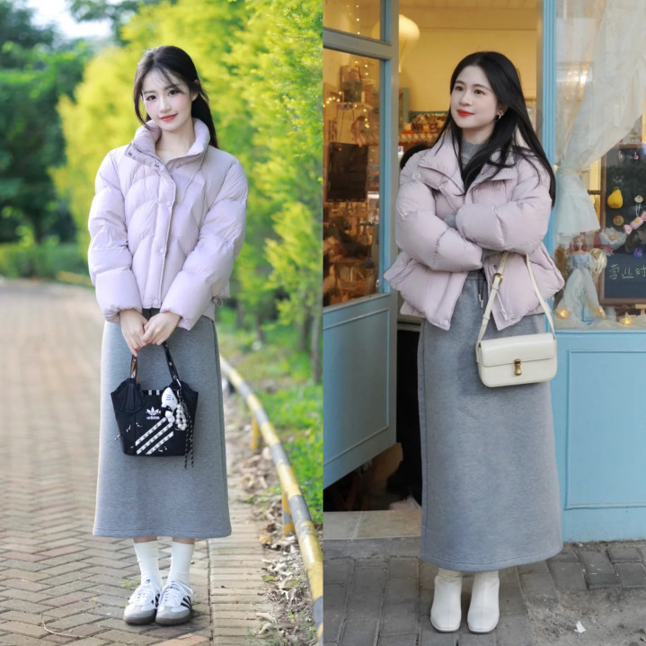 除了悼念灰等基础色,彩色系穿搭更显温存有氛围感哦!比如淡紫色短款羽绒服+灰色针织半身裙,从简大方又温存。