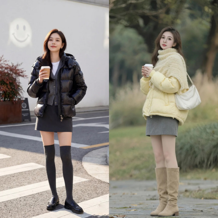 终末等于短裙搭配,短款羽绒服+短裙,可以搭配长筒靴偶然长筒袜,这么的短+短+长的组合,可以显瘦还显腿长,不外冬季穿搭仍是要御寒为主,可以搭配加绒打底裤。