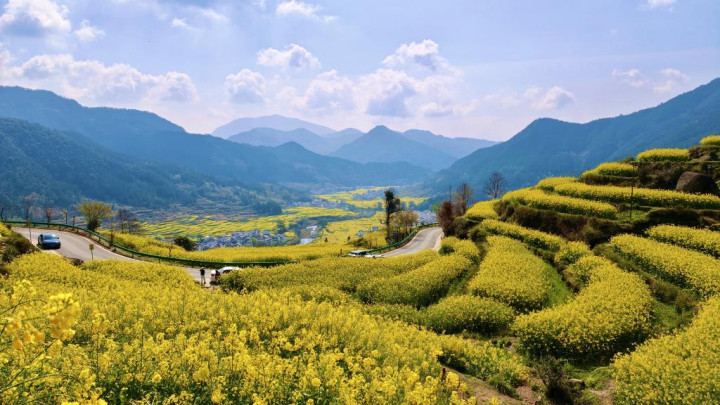 黎明的婺源江岭景区,晨雾刚刚散去,万亩梯田便在春光里铺张开来,金黄的油菜花顺着山势重重叠叠涌向山脚。