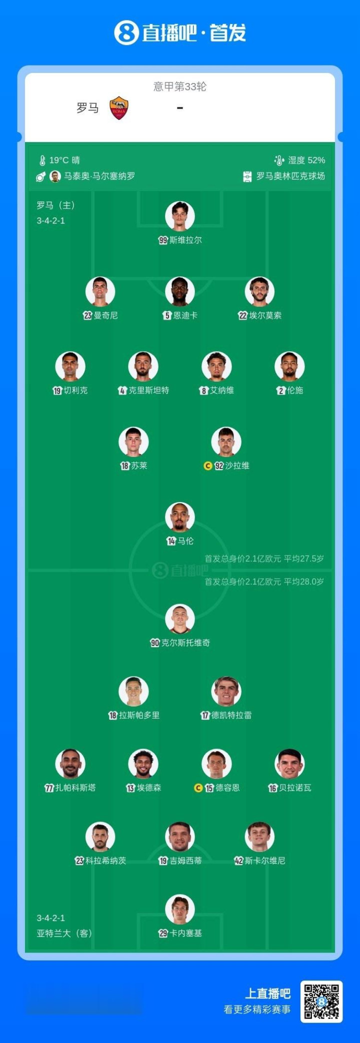 罗马首发:99-斯维拉尔、23-詹卢卡·曼奇尼、5-恩迪卡、22-埃尔莫索、19-切利克、4-克里斯坦特、8-艾纳维、2-伦施、18-苏莱、92-沙拉维、14-马伦