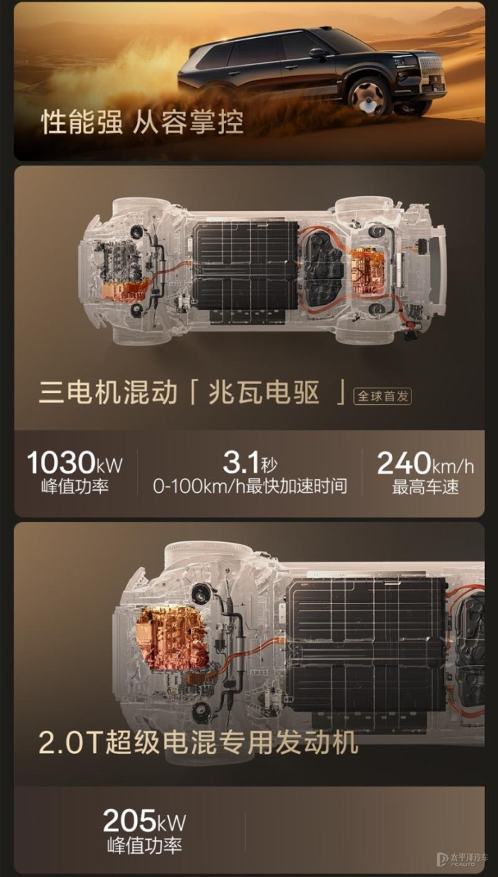 动力方面,极氪9X基于900V高压混动架构打造,全系搭载2.0T插电式混动系统,提供双电机版和三电机版可选,其中2.0T发动机最大功率205千瓦,其热效率高达46%,Max版和Ultra版前后电机最大功率分别为290千瓦和370千瓦,百公里加速3.9秒;Hyper版在前者基础上再增加最大功率370千瓦后驱动电机,电机总功率1030千瓦,百公里加速3.1秒,最高车速均为240km/h。