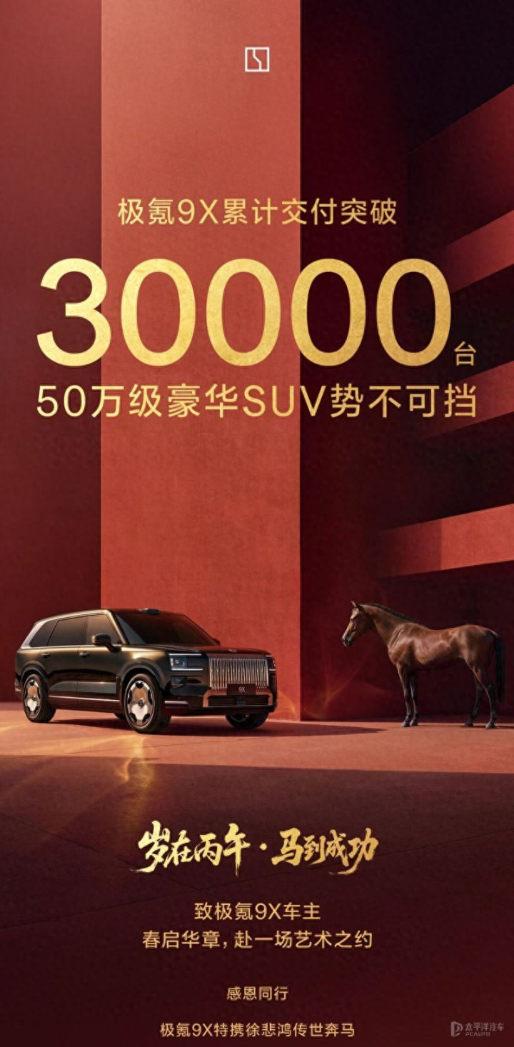 【太平洋汽车 新车频道】2月4日,从极氪汽车官方获悉,极氪9X自2025年9月29日上市以来累计交付突破30000台,其中去年12月销量突破10000台。目前极氪9X共在售4款车型,售价区间为46.59-59.99万元,同时推出专属感谢金,用于抵扣车辆尾款,若提车时间超过极氪App显示的预计交付最晚日期,极氪将按200元/天发放给用户,至高12000元。