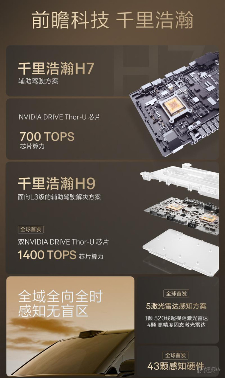 而H9方案则是极氪L3级智能驾驶技术架构,搭载双英伟达Thor芯片,算力1400TOPS,并配备5颗激光雷达、13个摄像头、5个毫米波雷达、12个超声波雷达、2个涉水雷达、6个车外麦克风共计43个感知单元,实现全场景智能辅助驾驶,可以做到高速和城市快速路的L3级智能驾驶,并且为城区以及车位到车位的L3智驾做好准备。