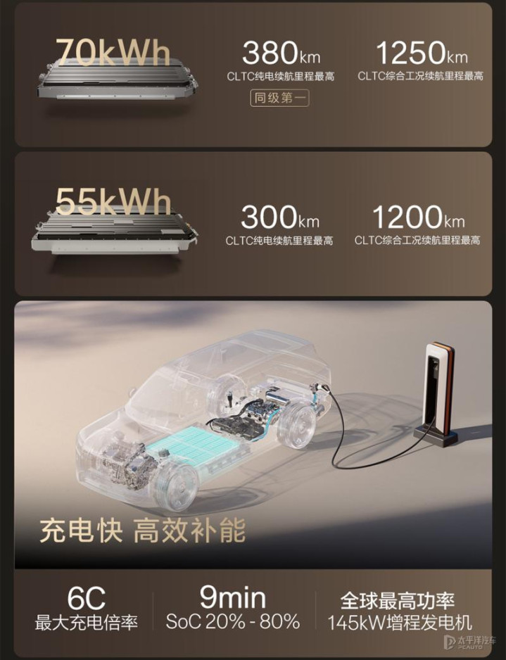 在续航方面,极氪9X提供容量55千瓦时和70千瓦时骁遥电池组可选,CLTC纯电续航分别为300km、288km、380km和355km,综合续航里程超1200km,支持最大6C充电倍率,SOC 20%-80%仅需9分钟。