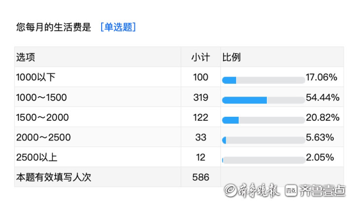 山东理工大学辅导员张媛,曾做过一份覆盖586名学生的调研。受访学生涵盖大一至大四,另有部分研究生参与问卷填写,男女比例为6:4。调研显示,以淄博这座城市为例,超五成学生月花费1000-1500元,20%在1500-2000元区间,1000元以下占17%,2500元以上的比例很少。