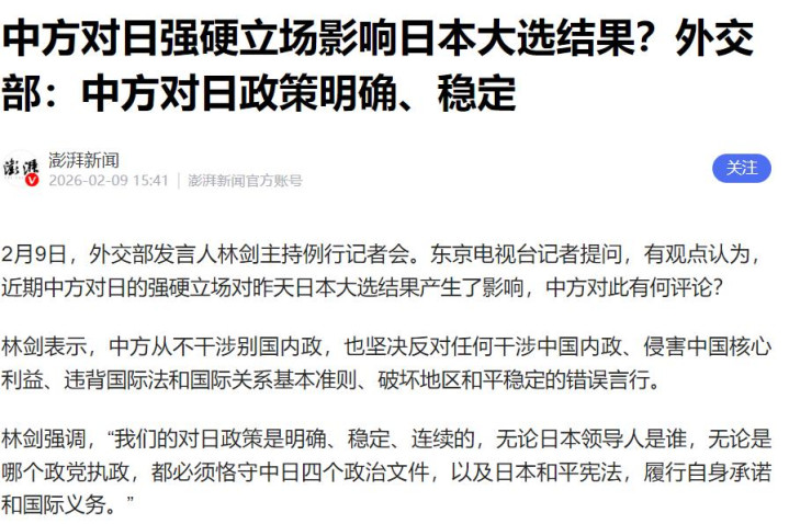 效果2月9日应答部例行记者会,发言东说念主林剑一句话把路堵死,中国对日政策“恒久明确踏实”,不会因为日本谁当首相、哪个党在朝而改动。