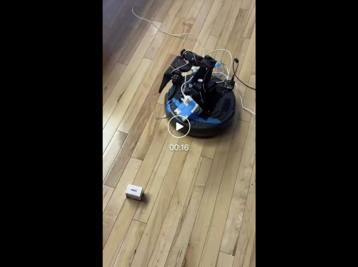 有人给扫地机器人装了根机械臂,现在不仅能扫灰尘了,遇到大点的垃圾也能顺手捡起。