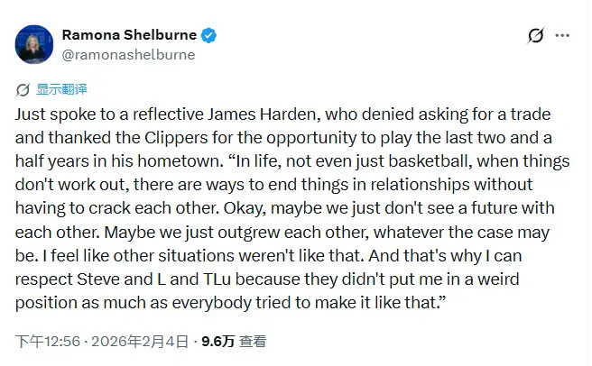 当然,交易达成后,关于“哈登这次到底是不是主动提出交易申请”成了一个争议话题,ESPN资深记者罗蒙娜·谢尔本(RomonaShelburne)在社交媒体上发表了一段哈登的表述,称哈登表示并没有主动向快船提出“交易申请”,“我不愿成为阻碍快船未来发展的绊脚石,希望他们能真正获得重建机会并积累选秀资本。而在克利夫兰,我看到了东部争冠的契机,尽管我渴望留在洛杉矶再战,毕竟从未夺冠过,但作为篮球运动员,我认为这里(克利夫兰)更有机会。”