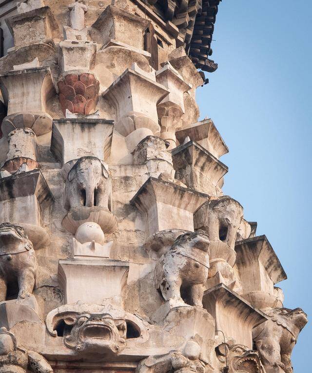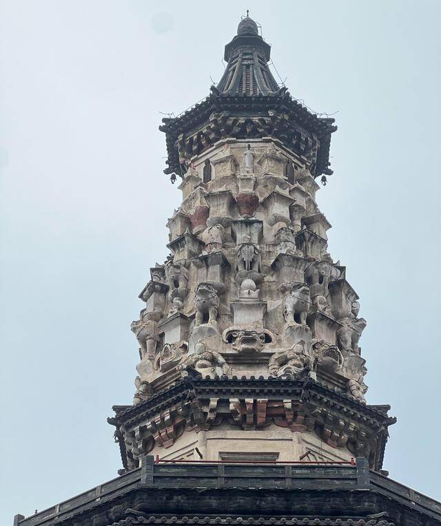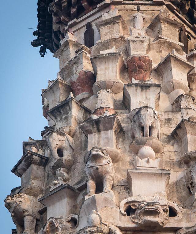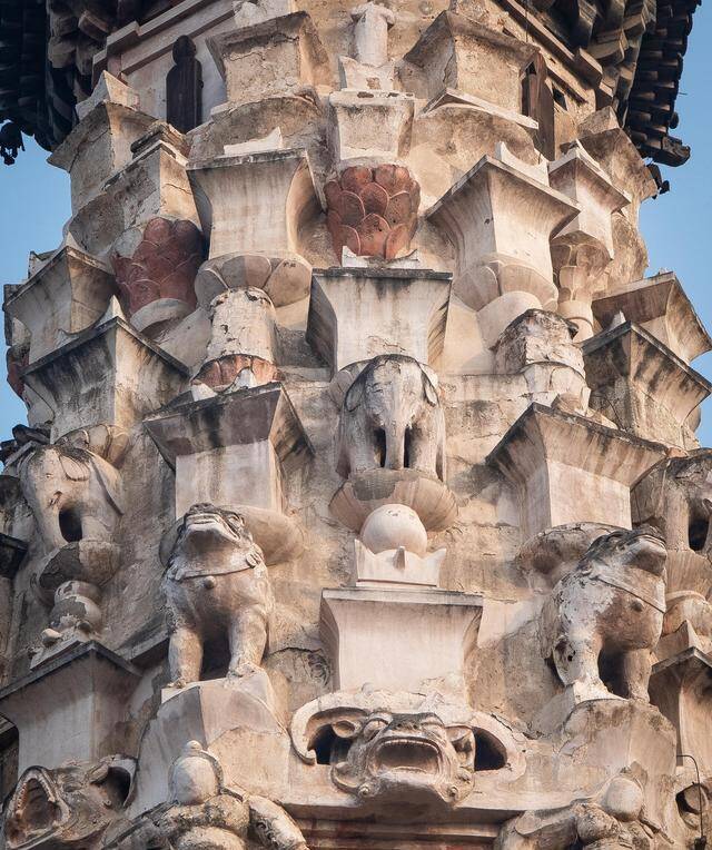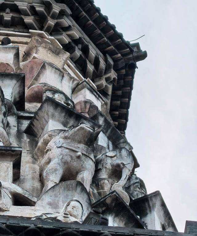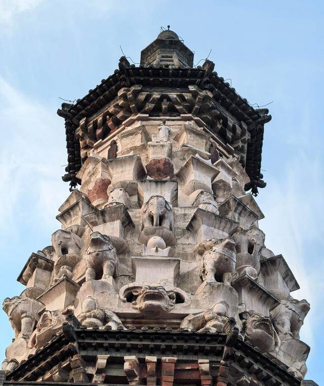 而这座塔信得过的精华,全在第四层,亦然它被称作华塔的中枢起因。第四层塔身呈圆锥体,一改下方的规整结构,混身全是综合的壁塑,沿着八角八面的垂线,交叉摆列服从士、海兽、狮子、大象,买球投注平台app还有佛像、菩萨等诸多形象,摆列得整整都都,却又涓滴不显拘束,每一个形象都灵活逼真,活灵活现,力士肌肉线条饱胀,情绪威猛,禽兽姿态强健,佛像体贴尊容,凑在全部,恰似一座五彩纷呈、包罗万象的袖珍雕镂艺术宫殿,远纵眺去,整段塔身就像一束饱胀盛放的花束,华好意思尽头,“花塔”之名,名副其实。这些壁塑不是粗陋的堆砌,每一个形象都有其寓意,龙豺狼狮象透着威严,防守着古塔,佛像菩萨带着体贴,传递着信仰,古东谈主将宗教文化与建筑艺术完满并吞,让冰冷的砖石有了温度,有了灵魂。在这之上,即是塔的顶层,高高耸起的八脊青瓦塔顶,千里稳大气,最尖端还冠以仰莲和宝珠,为整座塔画上了完满的句号,既添了几分灵动,又让塔身的线条更显融会,远纵眺去,华好意思中透着尊容,小巧里藏着大气。